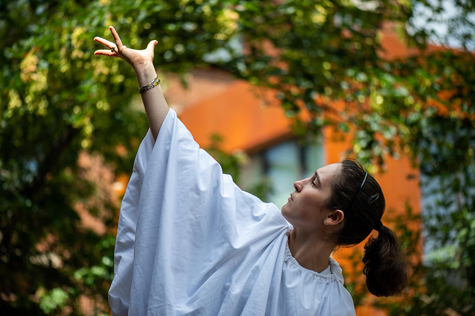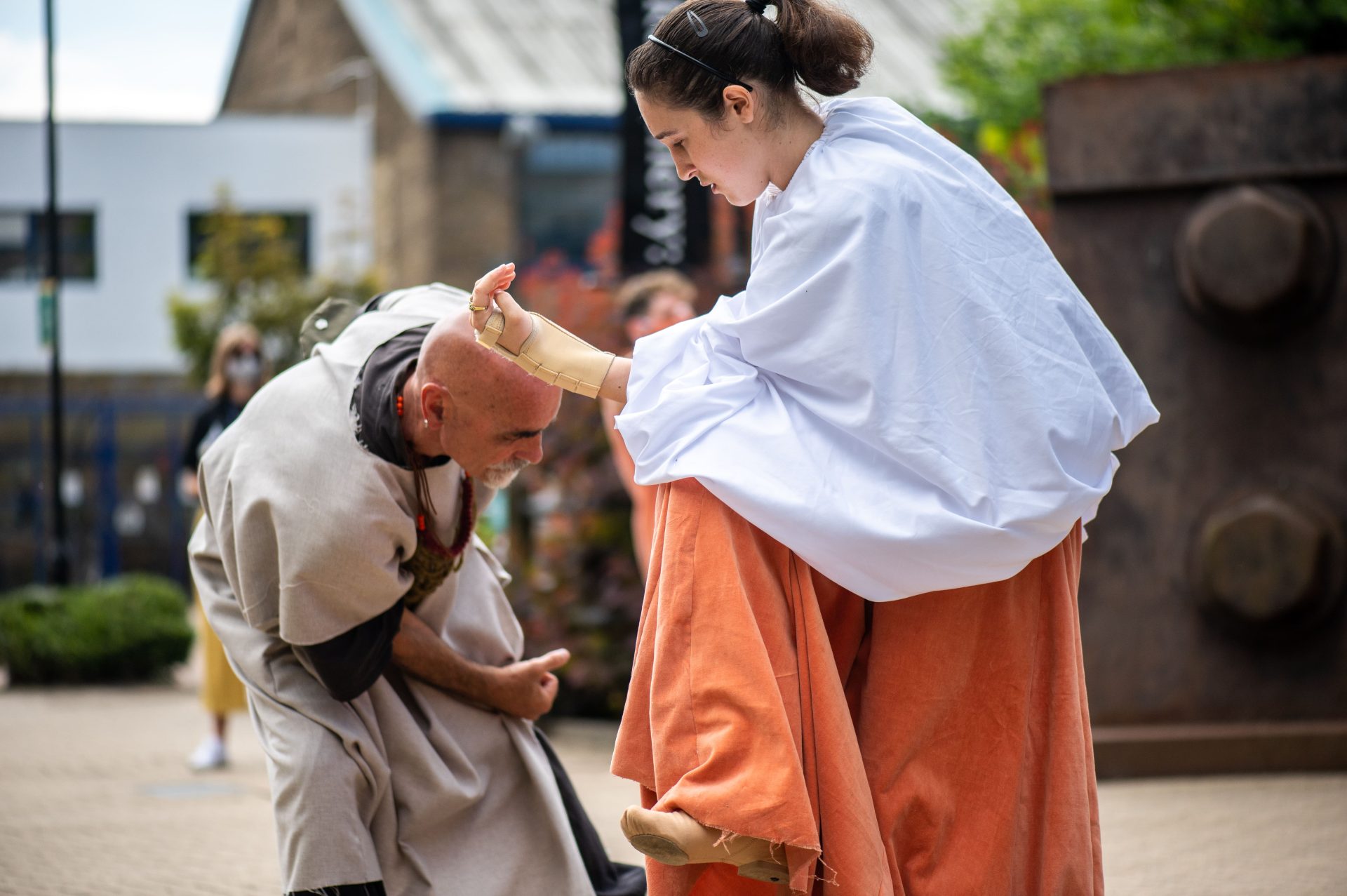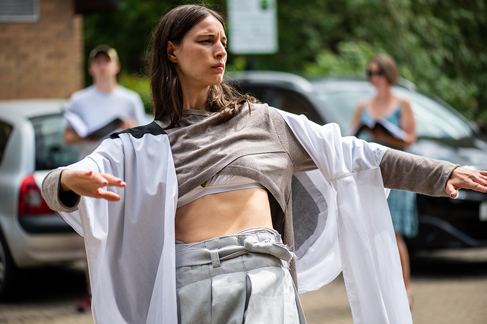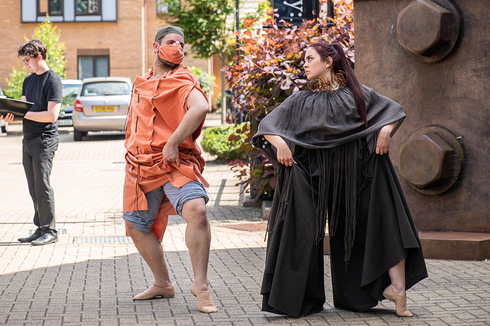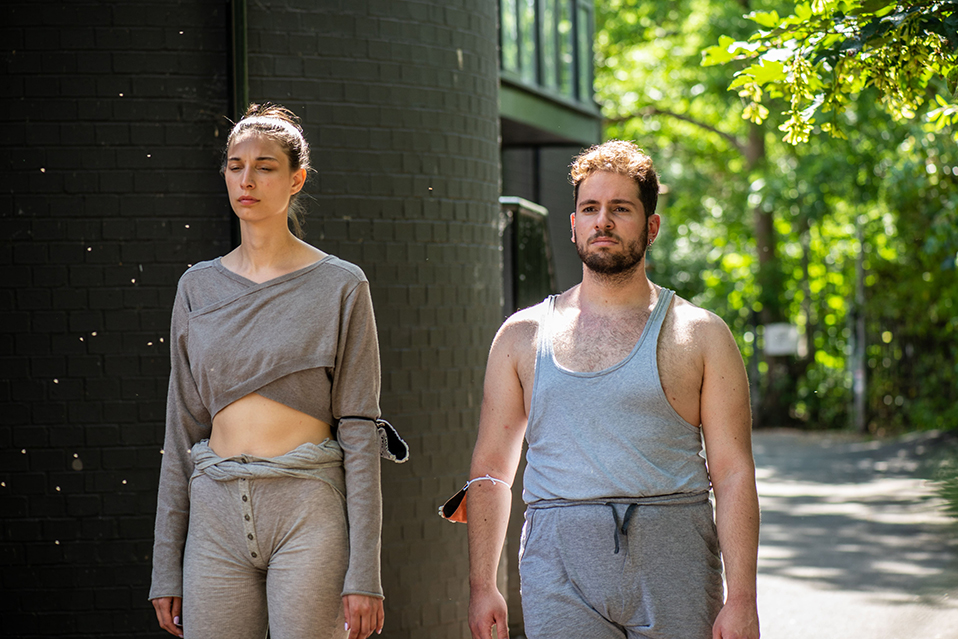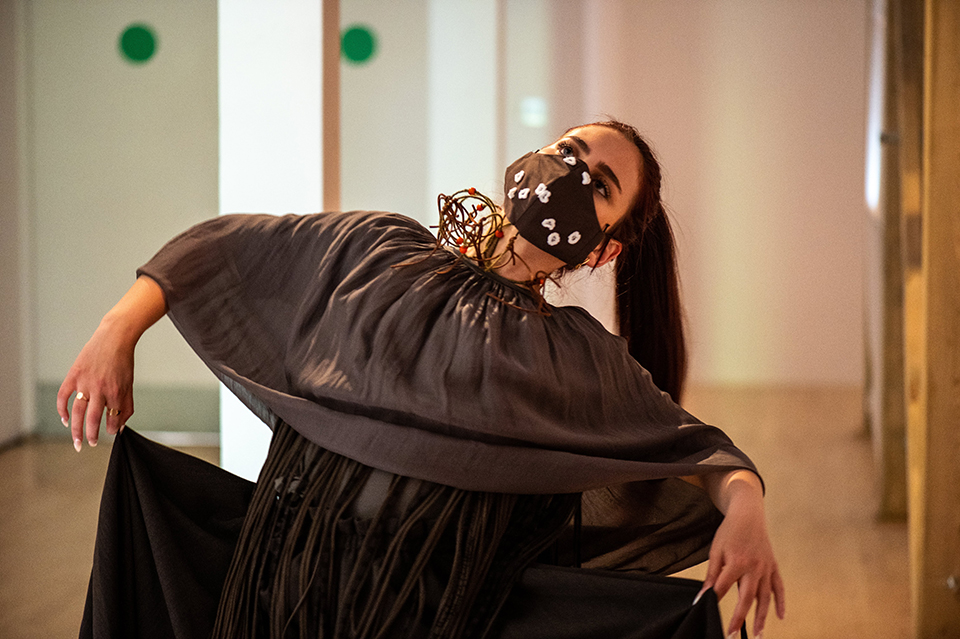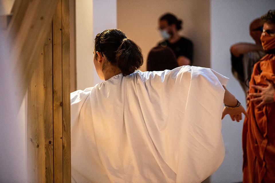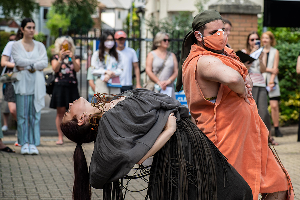 The performance was co-choreographed by Beatrice Jarvis from Kingston School of Art (KSA) and Athens-based Dionysios Tsaftaridis and was performed by KSA Dance students Joe Webster, Lucy Beadle, Libby Canagasabey, Jakub Ujczak, Natalia Linares and Jo Panagopoulou as well as professional dancers Pan Pavlopoulos, Akti-Magdalini Konstantinou and Laurie Booth. The dancers wore costumes that otherwise hang in the Gallery installation, which were developed by KSA Fashion students Meerim Mamatova, Eimear Kennedy, Klaudia Proskornicka, Erin Fairall, Izzy Oldland, Sayeon Kim, Yusun Lee, Daisy Gray, Joana Dias, Soyhun Lee, Eimear Kennedy, Milica Ceklerevac and KSA Fashion graduate Sebastian Nissl. The soundtrack was developed through a collaboration between KSA Music students and composer Apostolis Psihramis, musical directors Gabriella Noble and Jacob Ewens and performed by professional singers.