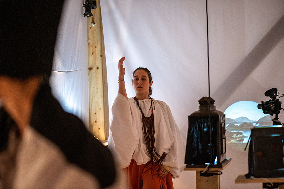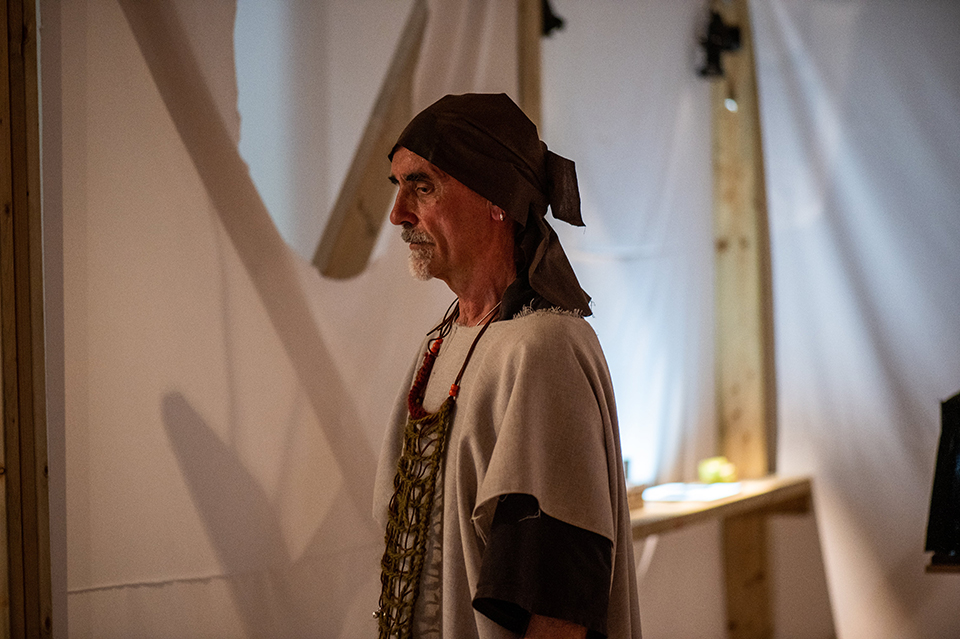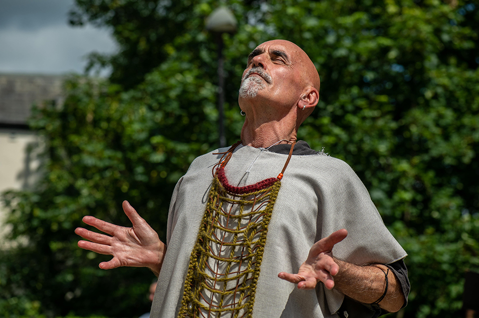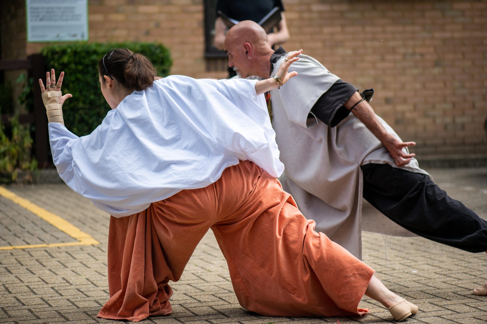 On 12 June, Ben Judd presented The Origin, a performance as part of his collaborative exhibition at the Stanley Picker Gallery. The performance embodied a fictional lost community who used to inhabit the island on the Hogsmill River where the gallery now stands and explored how fundamental aspects of this group’s identity can be manifested through movement and sound.
