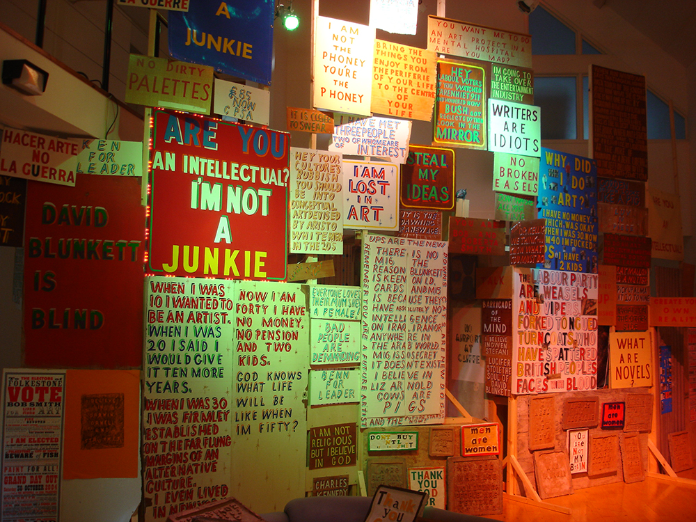 Bob and Roberta explore Art and Democracy. For Make Your Own Damn Art at the Stanley Picker Gallery, Bob and Roberta built a vast Barricade of the Mind made from texts and placards with slogans depicting the highs and frustrating lows of life on Earth.