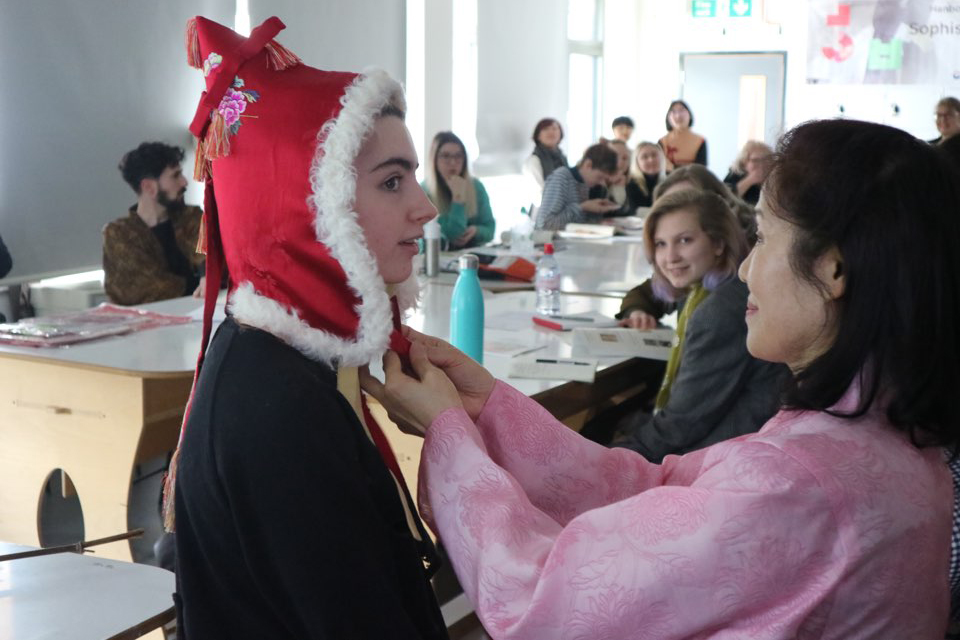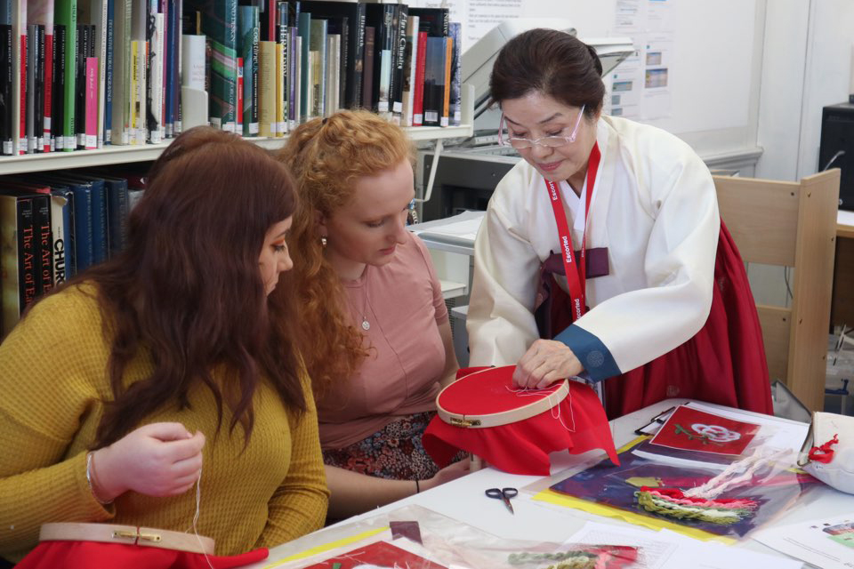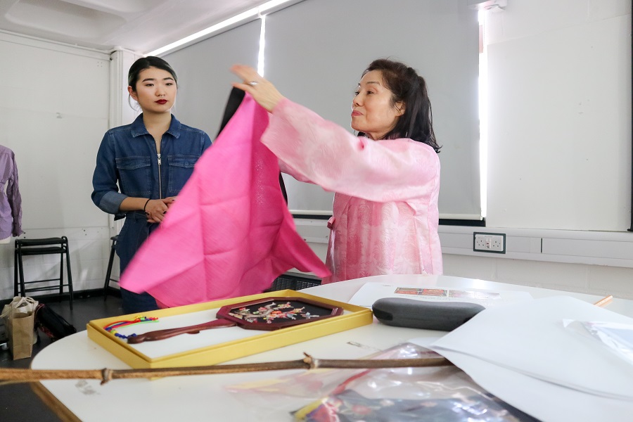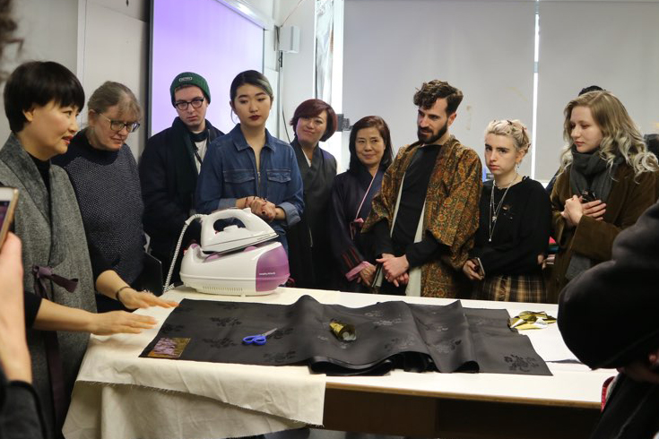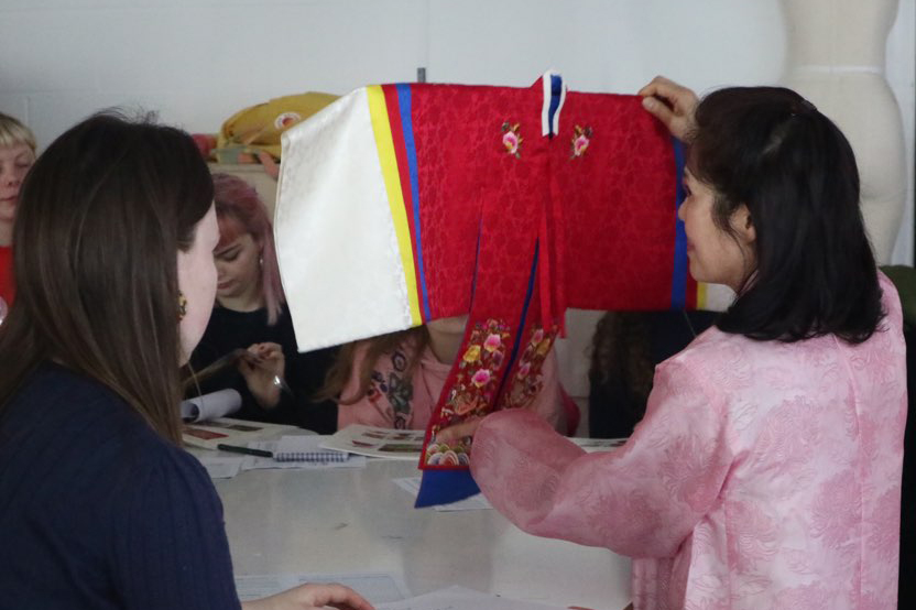 Representatives from the Hanbok Centre in Seoul Lee Hae-mi and Kim In-Ja delivered engaging theory lectures and specialist skills workshops to second year students at both institutions, who worked in groups at KSA and individually at RSN.The Hanbok Advancement Centre provided fabrics and workbooks for the students to produce garments and embroideries inspired by Korean, and performed a Hanbok Dressing Ceremony that will be repeated at 7pm on the launch, Wednesday 13 March. The exhibition of KSA and RSN student outcomes displayed at Stanley Picker Gallery Lobby and Project Studio, will travel to Seoul at the end of the year.”