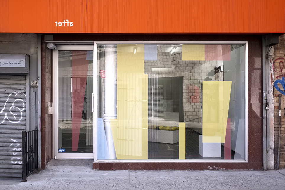 Condorelli exhibits works that reflect on Bayer’s legacy and P!’s institutional narrative. An abstract, window-scale vinyl frames the views between storefront and street. This is complemented by a multi-layered print on acrylic glass in a custom hinged frame, which hides and reveals simultaneously. Within the storefront, a series of large-scale drawings catalogue Condorelli’s practice to date, as both documentation and extension of past works.