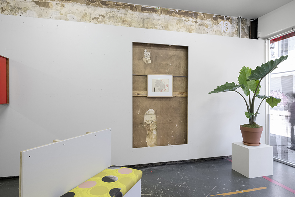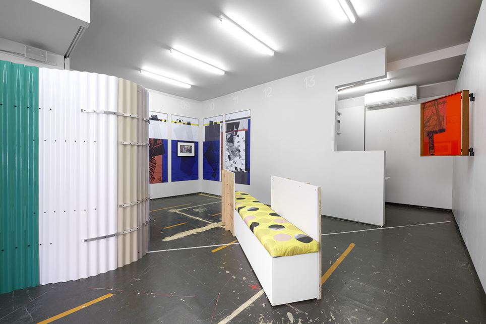 Other sculptural pieces relate to the conditions of the gallery space and directly address Bayer’s drawing. For Alteration to Existing Conditions, Condorelli recycles fragments from P!’s display architecture, which are repurposed within an upholstered seating unit for visitors to rest, converse, and observe. Constructed from locally-sourced corrugated plastic, a sculptural room divider / curtain, Epilogue, articulates the show’s space while adding a further layer of color and transparency.
