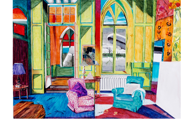 Landscapes and interiors are suggestive of private worlds; ideas about nostalgia for a perceived past that reside within the imagination; veiled warnings that we should not assume progress to be an axiomatically good thing. Thus, superficially opulent interiors often sit in conflict or opposition to scenes glimpsed through windows, with a very strong sense that this ‘view’ is a very private one, both literally and metaphorically. Having said all that, the idea of progress is symbiotically linked to the idea of continual growth, that mainstay of capitalist ideology and, by extension, does put Ian’s work within a political and economic context. There is a clear allusion here to the dilemma of late Capitalism, so consummately outlined in Fredric Jameson’s exceptional treatise, ‘Postmodernism or the Cultural Logic of Late Capitalism’, where (to put it in a nutshell) he draws our attention to the fact that whilst Capitalism bestows enormous material benefits upon us it also delivers an equal measure of the very opposite. This dichotomy is partly alluded to in the paintings via their discreet structural disharmony in the paintings, in one instance looking like a combination of a decorators dust sheet and a page out of Frank Ghery’s sketchbook.”