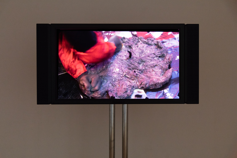 Comprising multiple durational interventions within the Gallery, Re-cut Piece (working title) introduces a layered process of re-organisation of technical, social and biological organs into a perverse aggregate. The installation includes a new moving image piece that takes documentation of a historic performance as its initial motif to display the activity of kneading dough into photocopier carbon and microphone windshields. Residues from the video’s production are redeployed in the gallery, whose space is also being figuratively kneaded over the course of the week.