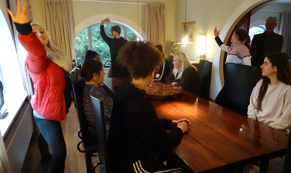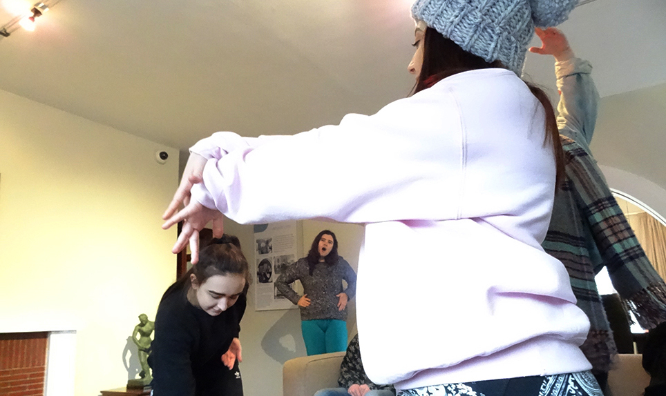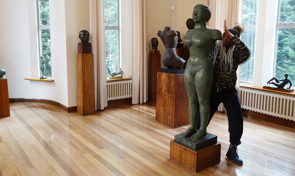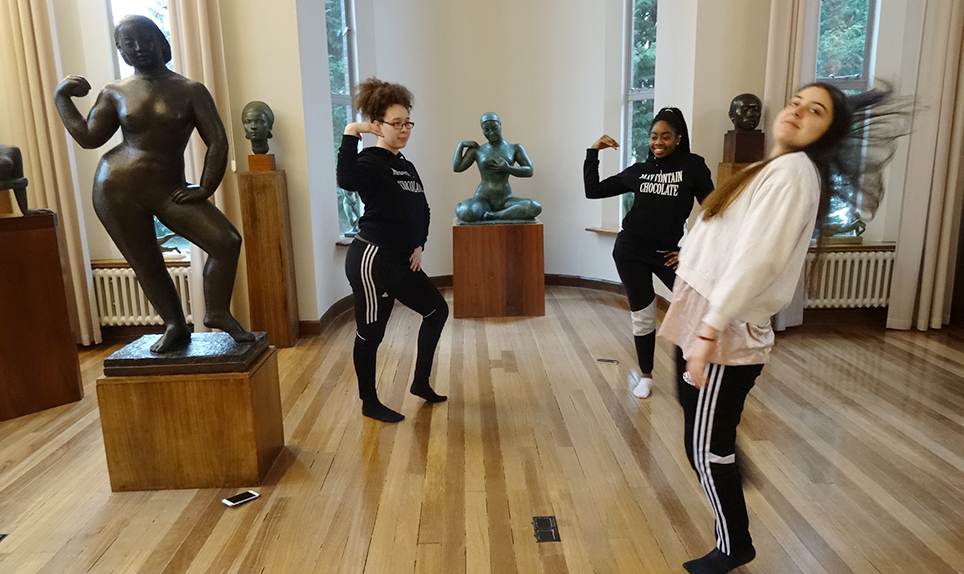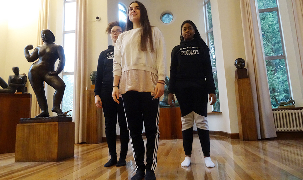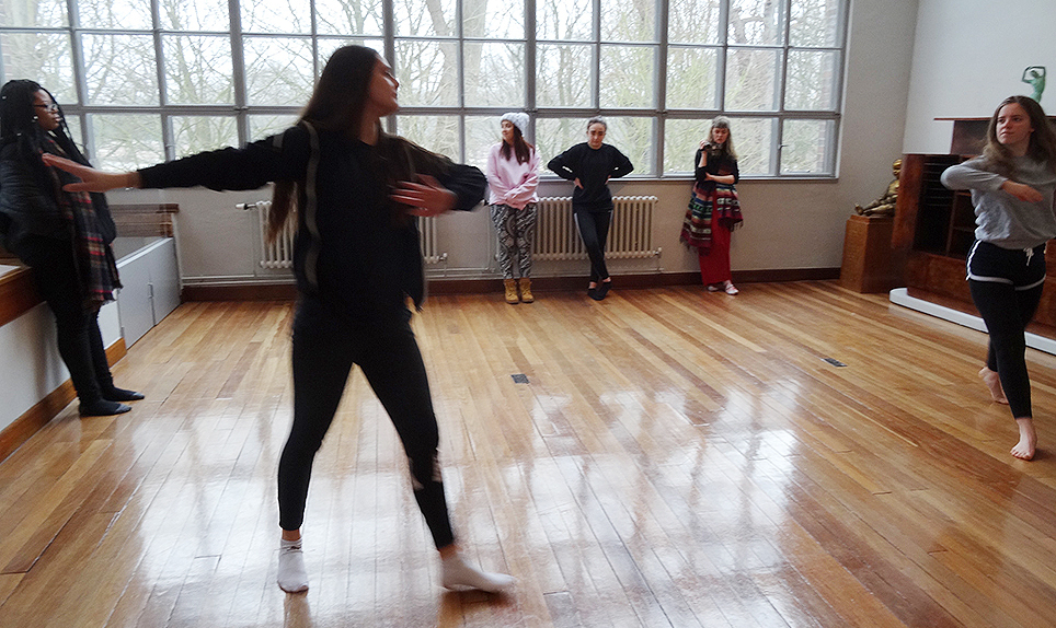 In the first of their workshops, dance students undertook a guided museum tour, in which they handled Gordine’s bronze sculptures of dancers and attempted to recreate some her most ‘imaginative’ forms. They also ‘sculpted’ each other and made observational drawings of the outcomes, and generated free writing to capture first impressions. The group met professional flamenco dancer, and museum guide, Christine Goodwin who offerer her personal interpretation of Gordines’ Esso commission ‘Power’ (1960), said to have been modelled for by fellow flamenco dancer (the notorious) Trader Faukner. Christine also shared fascinating research into Richard Hare’s telling of Arabian nights at parties, and while demonstrating actions relating traditional Indian movements and flamenco, explained how each has it’s own unique narrative, that inform both the character of the dancer and the response of any observer.