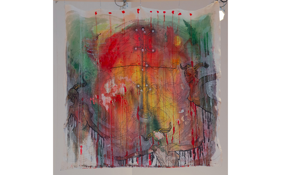 The exhibition’s title refers to David Bowie’s rock musical spectacular from 1973, The 1980 Floor Show, an experimental collaboration between Bowie and other artists that has languished in TV archives for many years after its initial airing on American TV. Its reappearance online has disinterred it as a cultural object and reinvigorated interest in a glamorous cultural oddity created against the backdrop of global economic and political volatility. Floor Show is seen by the group as a flamboyant metaphor for the gallery as a space of presentation, choreography, multi-media assemblages and awkward but productive juxtapositions. Paintings, wall hangings, videos, audio works, sculptures, wall text and drawings sit along-side each other in the spaces of the Stanley Picker Gallery and will languish as forgotten images on the internet or be taken up and used by others. The works tackle themes such as power, social trauma, gender politics, the body and feminist science fiction.