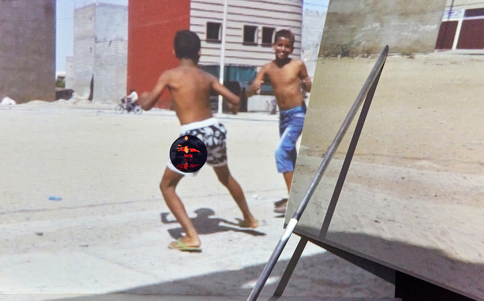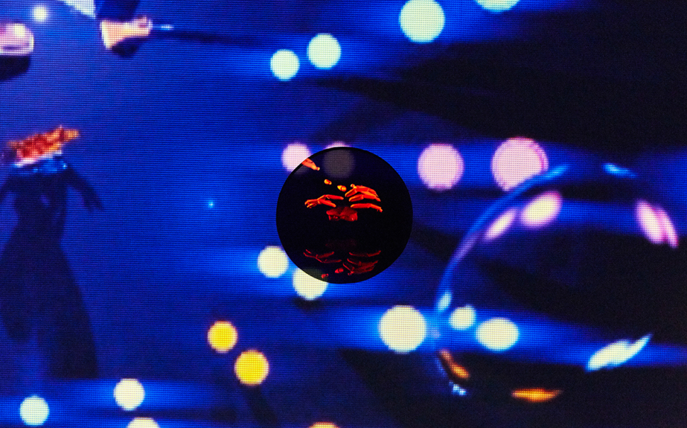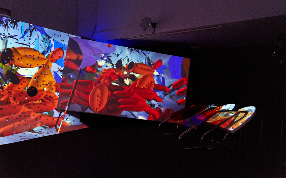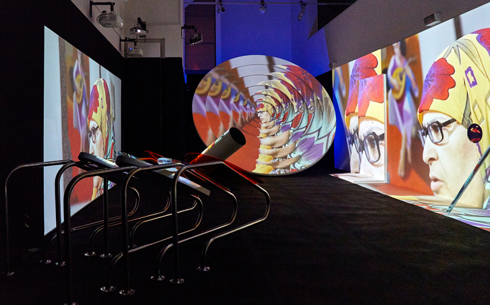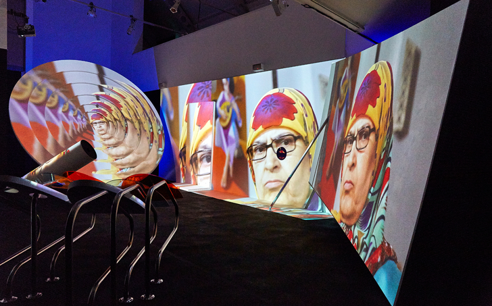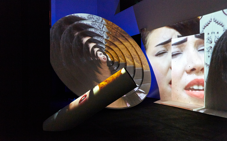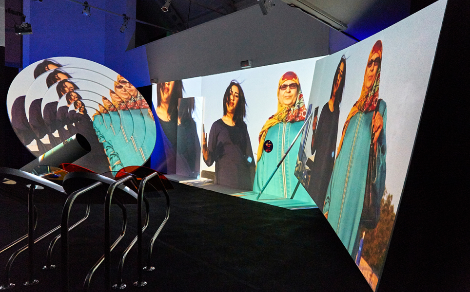Shot by the artist on handheld camera, Siham & Hafida juxtaposes the raw essence of docu-style TV with surreal digital animations to narrate the intergenerational complexities of evolving cultural forms, embodied by two popular Moroccan chikha singers of different ages. Its presentation in the Gallery takes the form of a multi-channel projection that overlaps walls with large-scale scale props as a series of interconnected screens, creating a dynamic and playful expanded-cinema effect throughout the whole space.