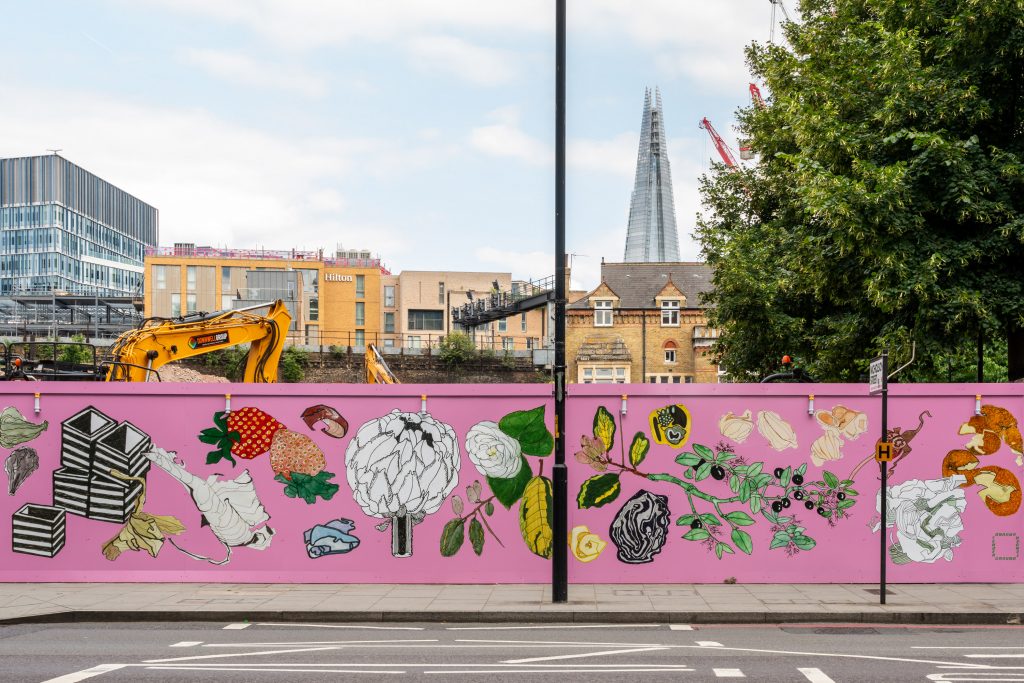 One of the discrete physical outcomes of the commission was the creation of the bold and beautiful design for the hoardings, which now surround the site on Blackfriars Road during redevelopment. The design for the hoardings, a collaboration with graphic designer Charlie Noon, uses Jenny’s drawings of nature observed within the garden or views from her window; these now surround the building site with a visual and poetic memory, an honouring of what was there before.