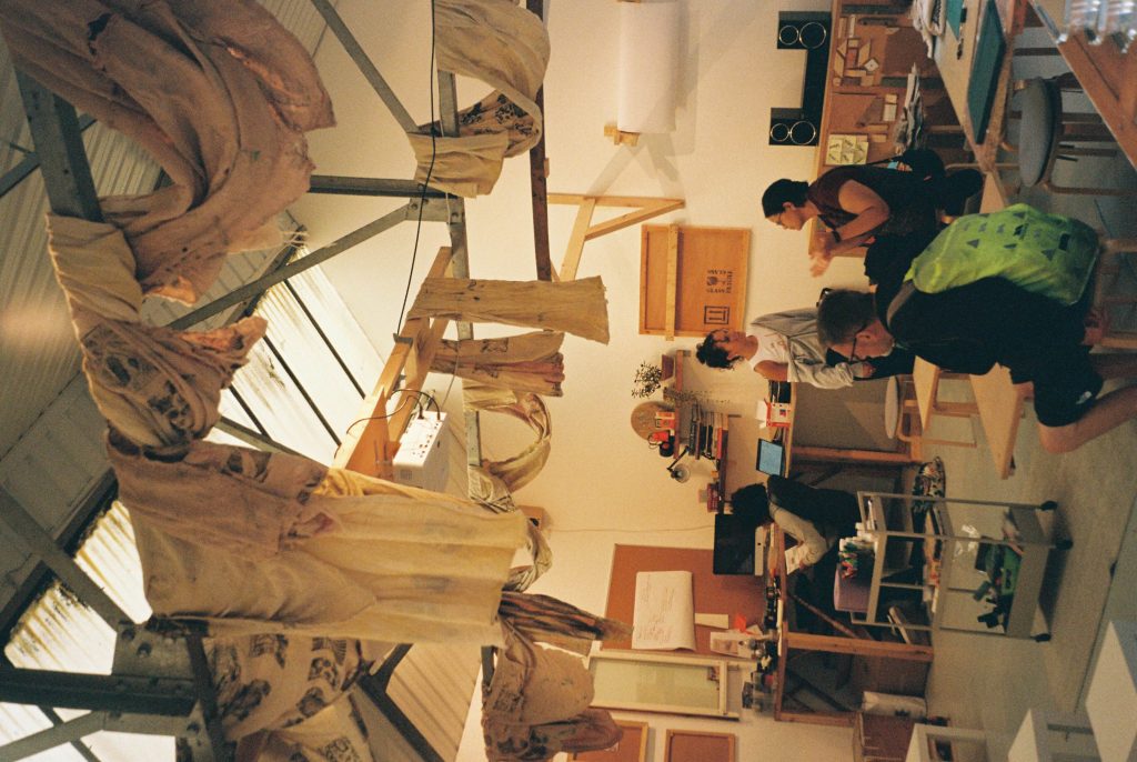 Guided by this question, we built an “open studio” in the gallery space of Bloc Projects, once again using materials we had foraged and salvaged from cultural spaces and organisations across Sheffield. It became a space for assembly but also one to foster connection and facilitate deep collaboration, containing utilities to support various practices (such as a scanner, paints, desks, and office chairs) as well as tools for exhibition and performance.