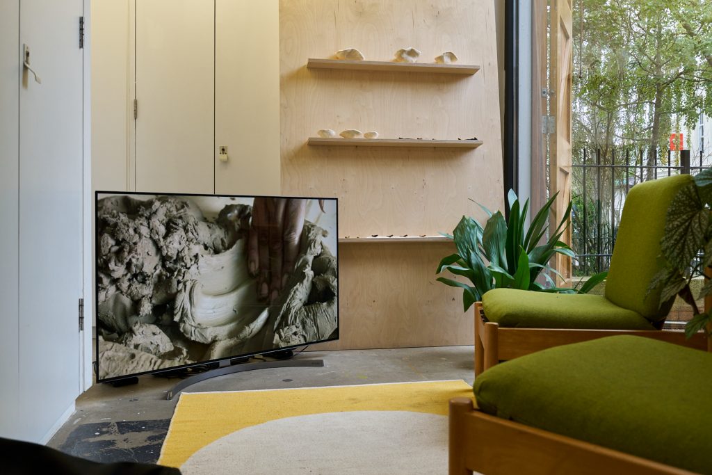 between body and clay documents the intimate relationship of being with and processing raw clay within Robinson’s practice, made in collaboration with artist Rhiannon Hunter and supported by SHAPE Arts – 2024 Adam Reynolds Award. The clay in the film was gathered in London from a local cemetery and is used within the installation ‘softening inherited knots’. In its original form, the raw clay is dry and unmalleable, necessitating physically demanding gestures of care – removing debris, such as sand and stones, soaking the clay body in water, and burying hands in both the clay body and the water to create clay slip. These processes foster prolonged, repeated, and intimate engagements, creating a relational practice that explores clay and the body as material sites for ancestral liberation.