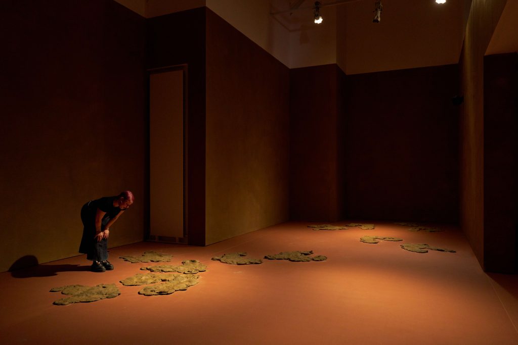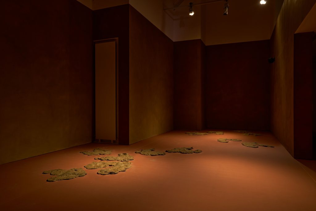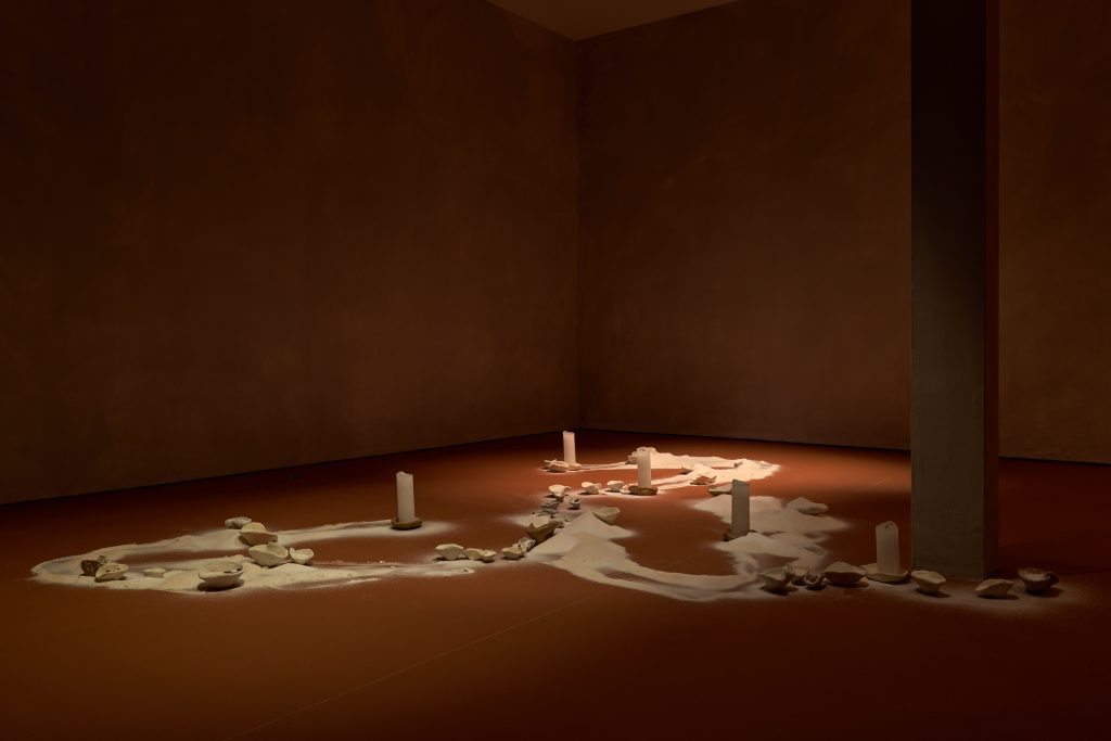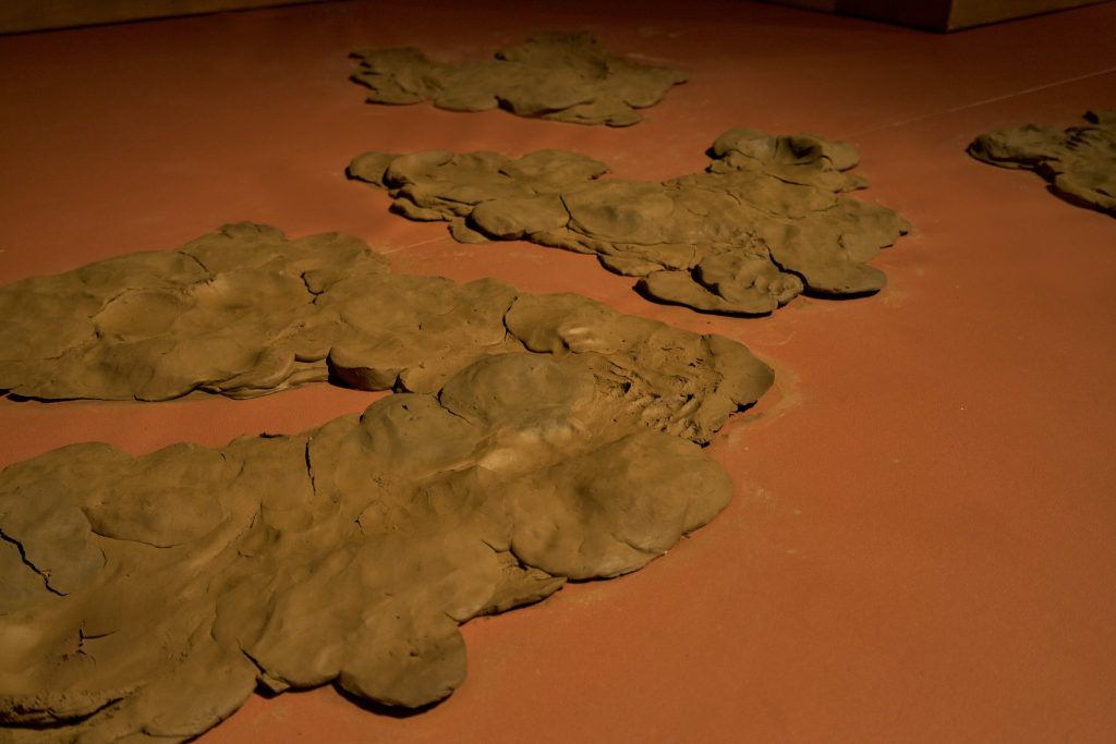 Formed through a series of solitary performances, softening inherited knots is the first in a sequence of durational, site-specific installations developed between the body and clay, tracing an embodied practices of uncovering how racial trauma is held and felt within the physical, spiritual, and ancestral body. Holding trace impressions of Robinson’s body, the sculptural works made from raw London clay become sites/earthworks of ‘blackened knowledge’, forming a relational partnership between body and clay as the corporeal body of the earth. Adding to the earthworks throughout the duration of the exhibition, Robinson will return to the installation as a continual practice of engagement between clay, breath, and the body. Through engaging with clay during its varied states of malleability and engaging the body through states of embodied breath and somatic practices, the earthworks conjure an intimate relationship between body and clay as co-collaborators in the active undoing of racial trauma and conduits to healing modalities.