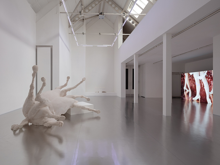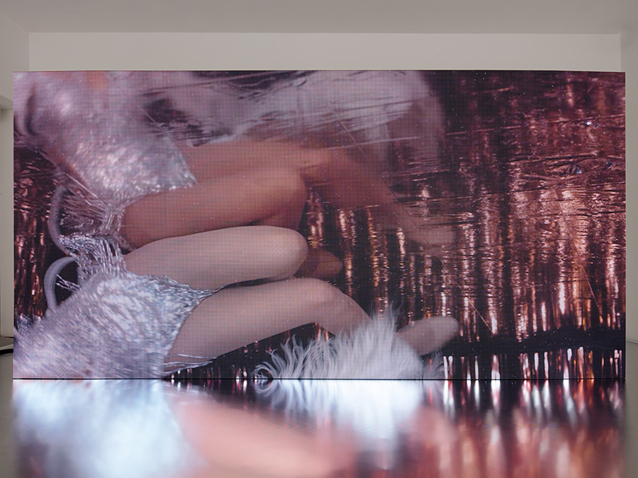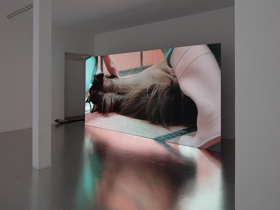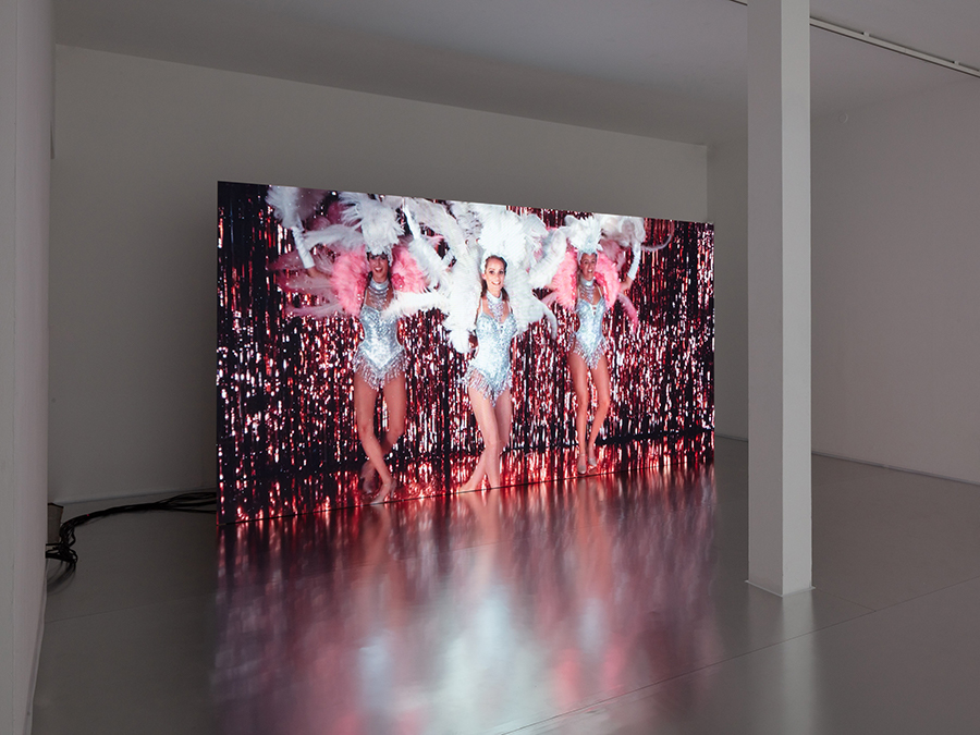 The new film work The Odds (part 1) brings together racehorses anaesthetised and collapsed on ketamine in a ‘knockdown box’, showgirls from a casino in Macau belonging to the world’s biggest political donor, and Steve Ignorant from anarcho punk band Crass performing in a bingo hall originally built as a cinema designed to look like a church. Produced specifically for a large LED screen, the footage is overlaid with pulsating light formations inspired by Vegas techniques of visual seduction. The interconnections evoked draw logic from apophenia – a psychiatric term describing the tendency to perceive meaning connections between unrelated things or patterns in random information. The resulting assemblage is eternally based on luck, and responsive to the other elements in the space.