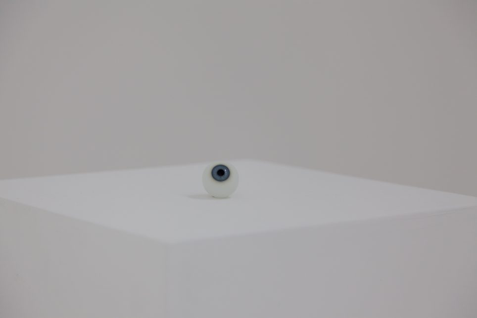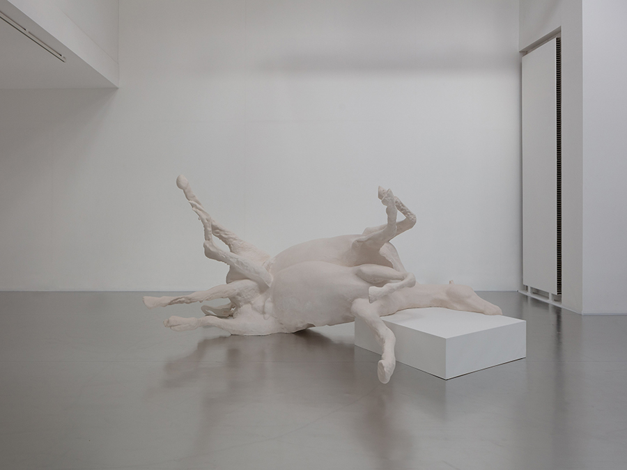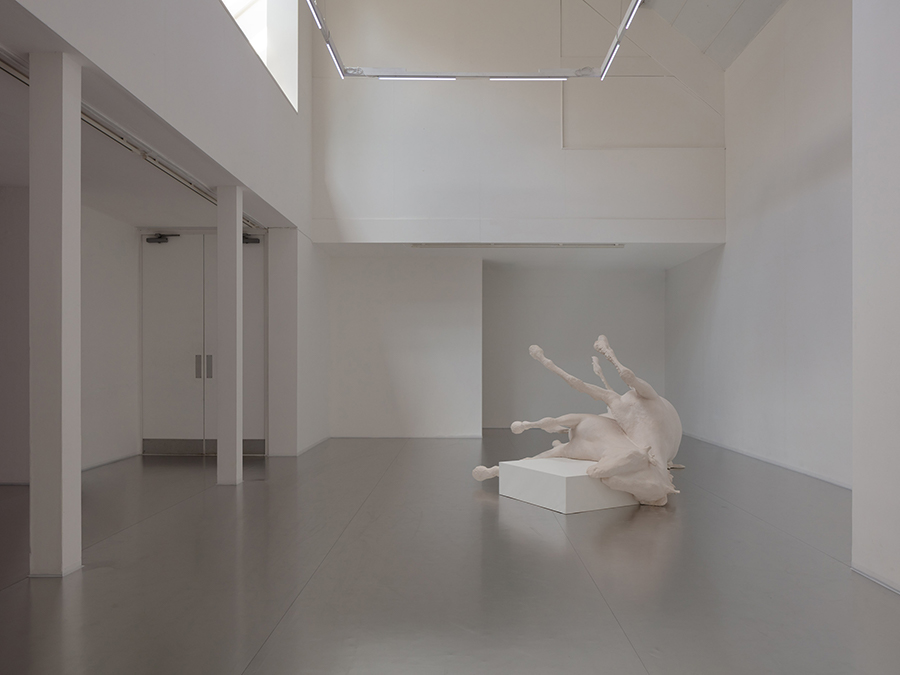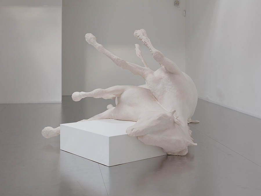 Elsewhere is a constellation of objects, a sculpture made from scans of the collapsed bodies of thoroughbred racehorses (The Fall, 2019), casino chips made in China from clay dug out in Jerusalem (The Circuit, 2019), a subtitle track projected on the wall and a glass replica of one of the artists’ eyes (The Opening, 2019), hovering somewhere between commodity and amulet.