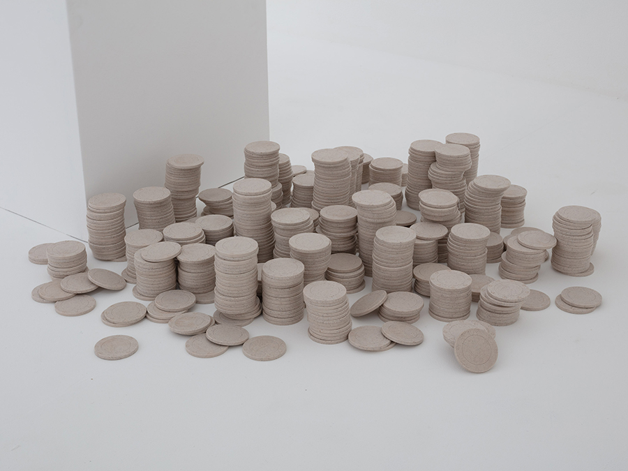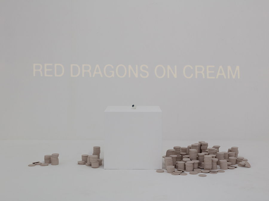 Taking inspiration from Brown and Venturi’s ‘Learning from Las Vegas’ as much as Brian O’Doherty’s ‘Inside the White Cube’ – both examining how spaces are conferred symbolic meaning and structures – the exhibition is arranged as a space in which the lighting, sound, scent and atmosphere all follow subliminal strategies devised by the gambling industry.